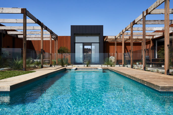 A spectacular new home in country Victoria, deep in the heart of Ned Kelly country. This is a dramatic landscape of gentle hills, dusty earth, giant boulders, big skies and panoramic views across the Strathbogie Ranges. Constructed from concrete, glass and corten steel, it references the red oxide in the surrounding rocky landscape and perhaps even a touch of the Ned Kelly spirit.